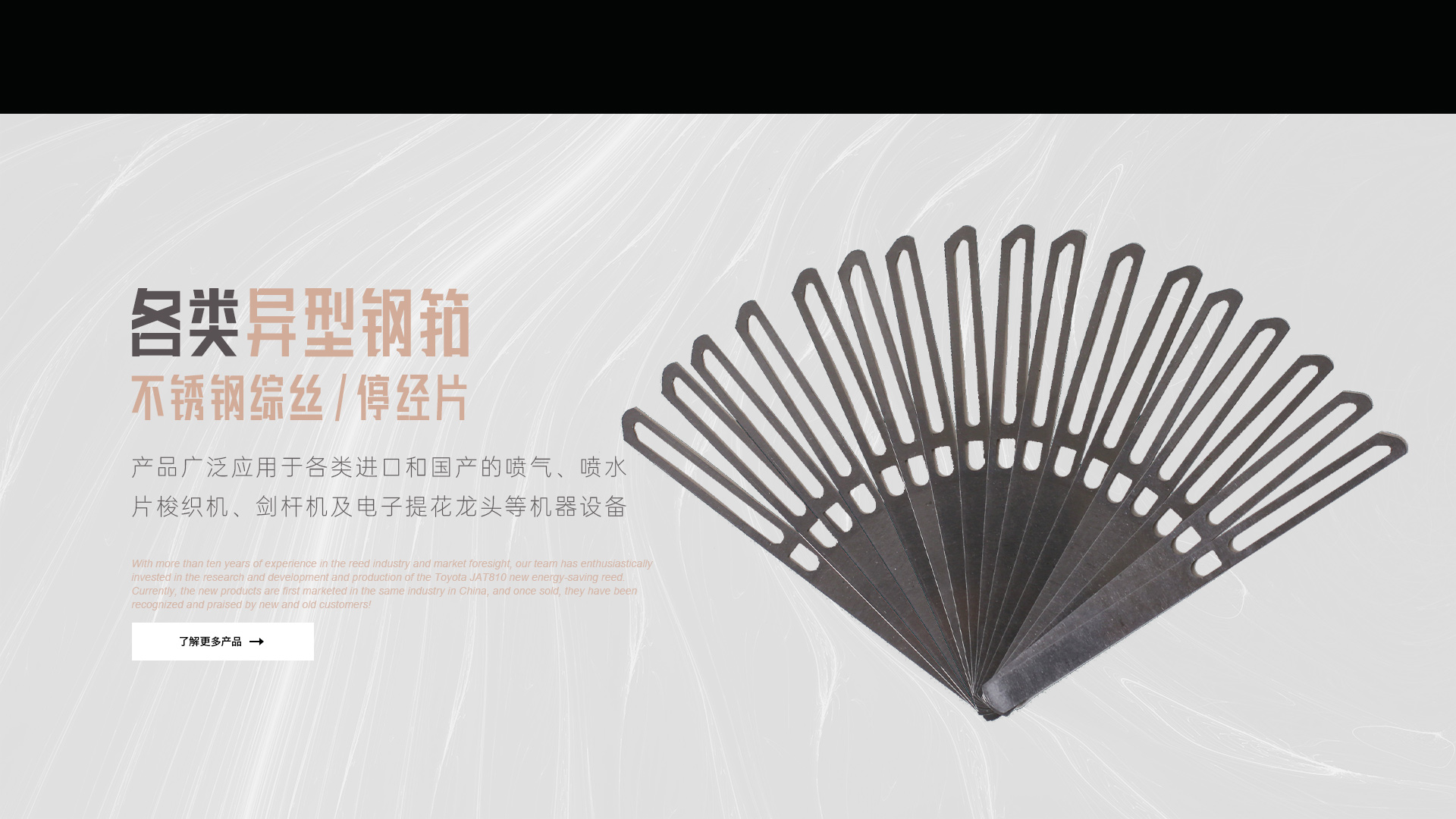 從事研發生產及銷售各類新型紡織器材的生產型企業。公司主要產品有:噴氣織機用各類異型鋼筘(傳統型豐田JAT710鋼筘及新研發的豐田JAT810節能筘);不銹鋼綜絲及不銹鋼停經片。我們的產品廣泛應用于各類進口和國產的噴氣、噴水、片梭織機、劍桿機及電子提花龍頭等機器設備。